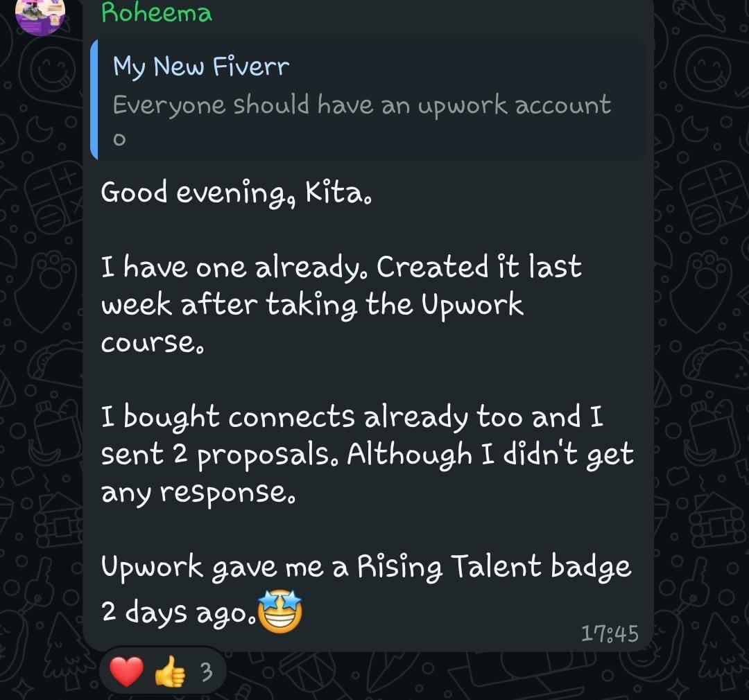 Roheema got the upwork Rising Star badge after taking my Upwork course