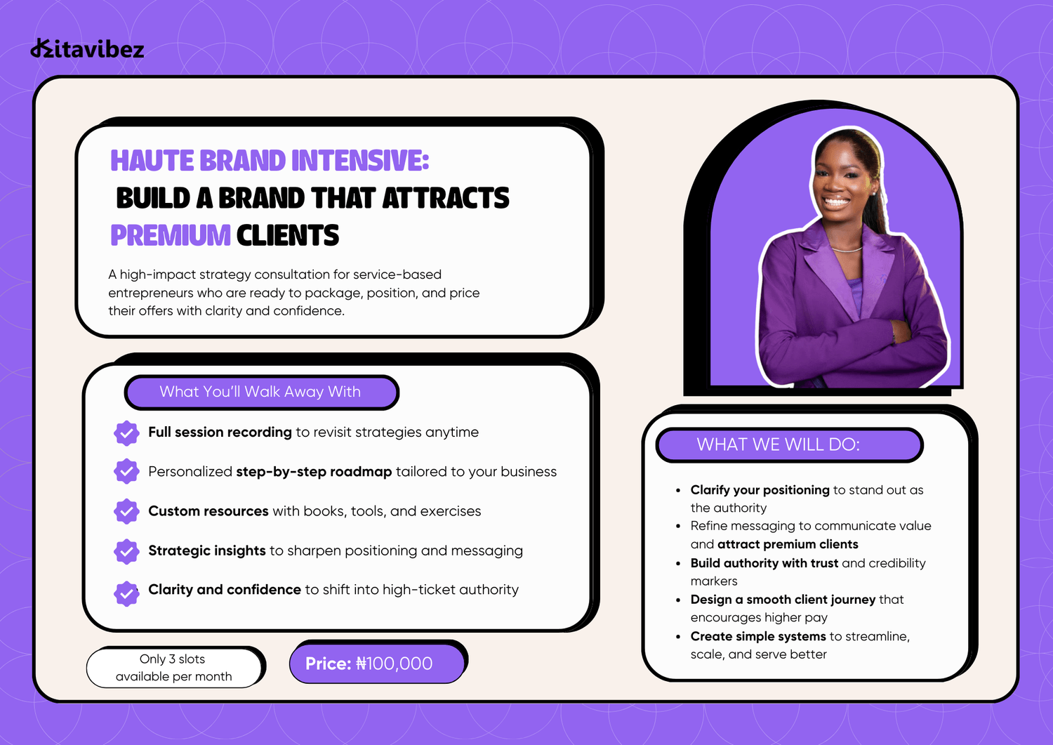 The Haute Brand Intensive is a 3-hour private strategy session that helps service providers and entrepreneurs upgrade from low-ticket hustle to premium authority.