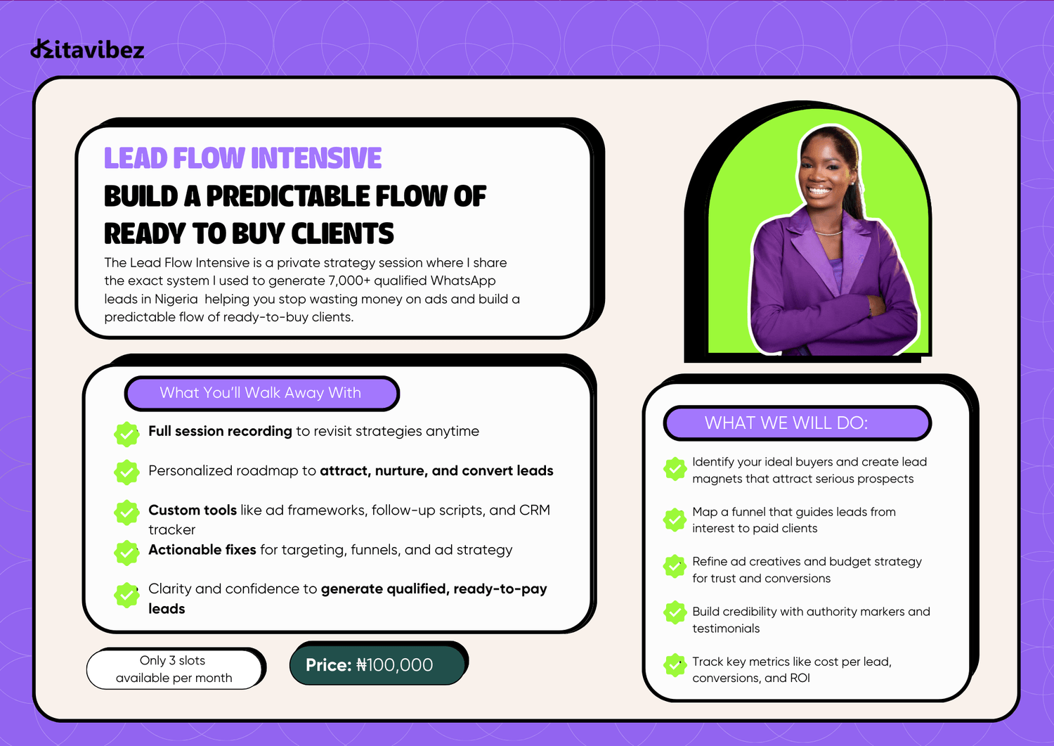 The Lead Flow Intensive is a 3-hour strategy session where you’ll learn the exact system I used to generate 7,000+ qualified WhatsApp leads in Nigeria.