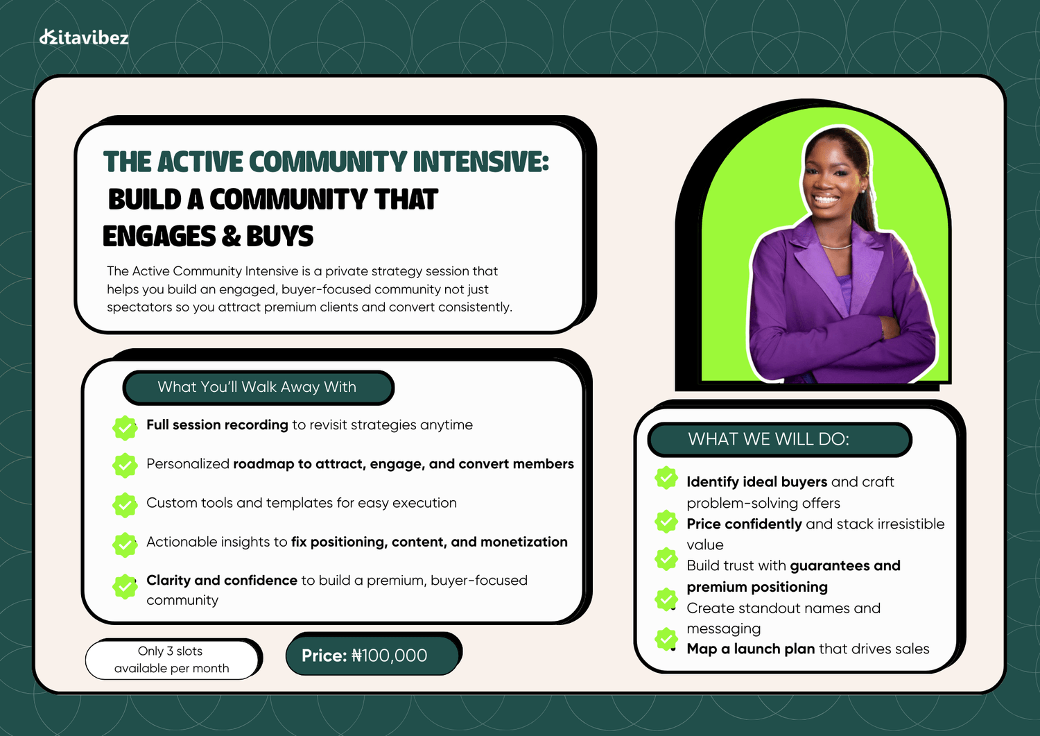 The Active Community Intensive is a 3-hour private strategy session that helps coaches, service providers, and entrepreneurs turn silent, freebie-filled groups into vibrant, structured communities filled with premium buyers.