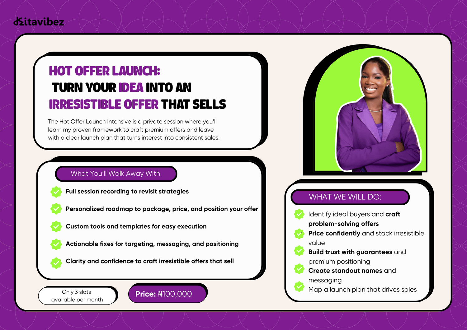 The Hot Offer Launch Intensive is a 3-hour private strategy session that helps coaches, service providers, and entrepreneurs turn their ideas into irresistible, premium offers that sell out.